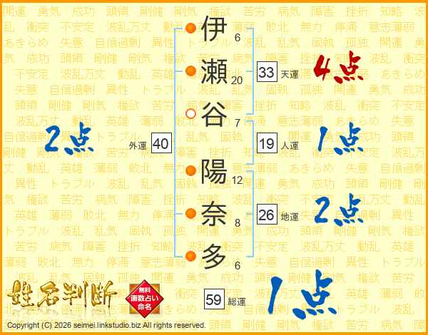 伊瀬谷陽奈多さんの地運は26画の2点!