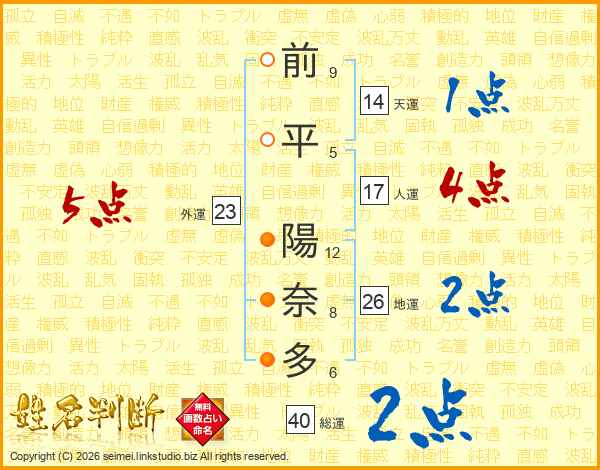 前(9画)平(5画) 陽(12画)奈(8画)多(6画)