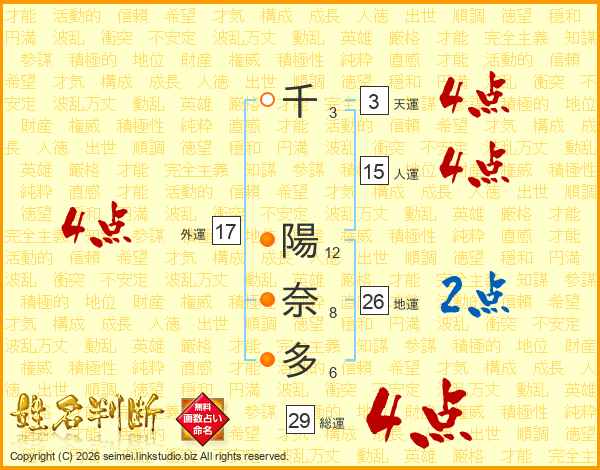 千陽奈多さんの総運は29画の4点!