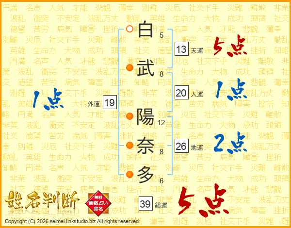 白(5画)武(8画) 陽(12画)奈(8画)多(6画)