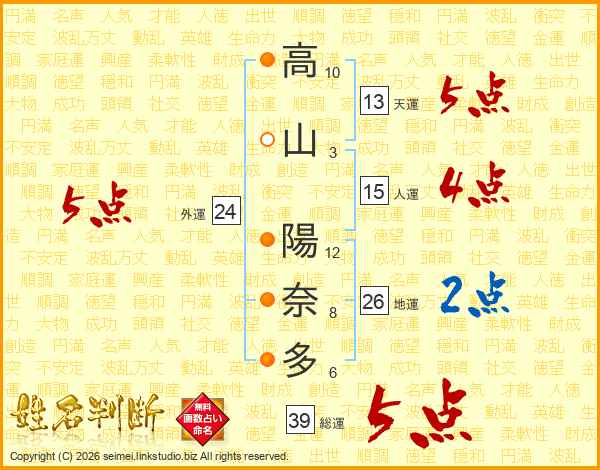 高(10画)山(3画) 陽(12画)奈(8画)多(6画)