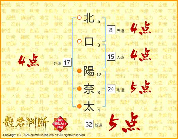 北(5画)口(3画) 陽(12画)奈(8画)太(4画)