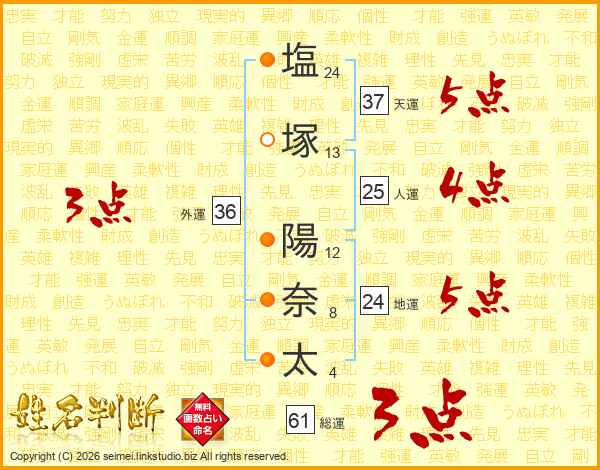 塩(24画)塚(13画) 陽(12画)奈(8画)太(4画)