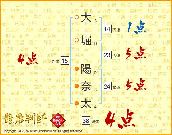 大(3画)堀(11画) 陽(12画)奈(8画)太(4画)