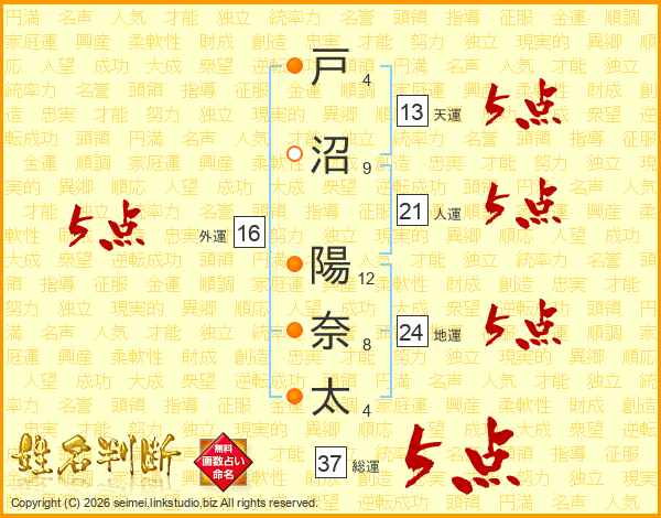 戸(4画)沼(9画) 陽(12画)奈(8画)太(4画)
