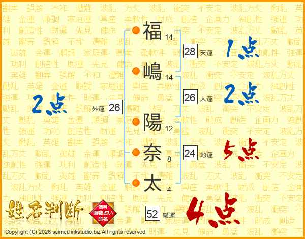 福(14画)嶋(14画) 陽(12画)奈(8画)太(4画)