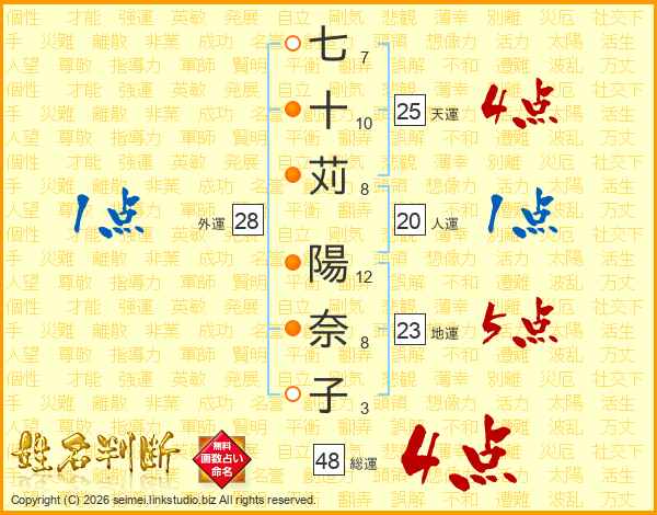 七(7画)十(10画)苅(8画)  陽(12画)奈(8画)子(3画)