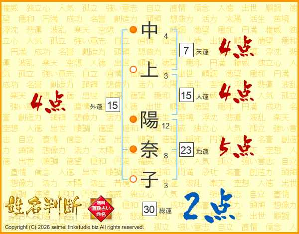 中(4画)上(3画) 陽(12画)奈(8画)子(3画)