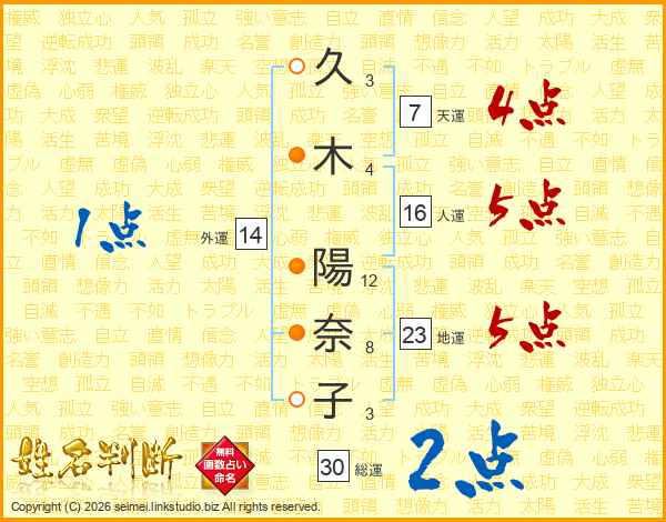 久(3画)木(4画) 陽(12画)奈(8画)子(3画)