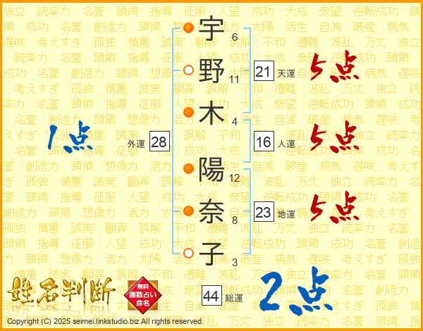 宇(6画)野(11画)木(4画) 陽(12画)奈(8画)子(3画)
