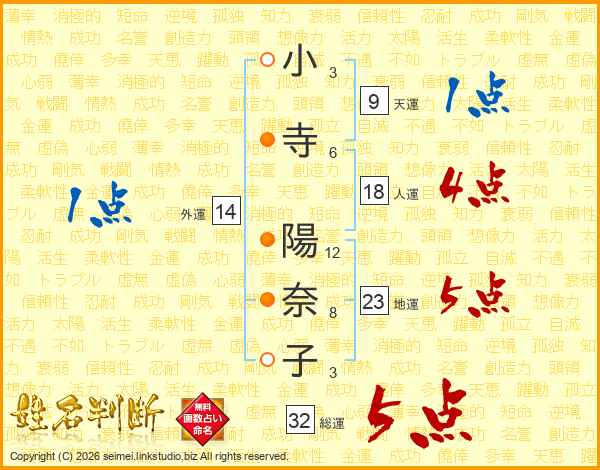 小寺陽奈子さんの総運は32画の5点!