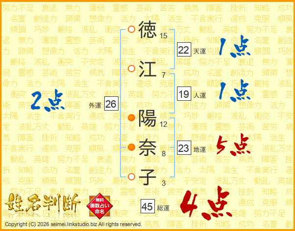 徳(15画)江(7画) 陽(12画)奈(8画)子(3画)