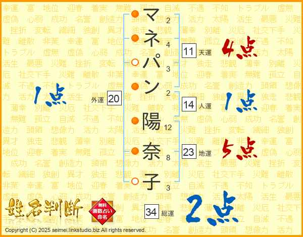 マ(2画)ネ(4画)パ(3画)ン(2画) 陽(12画)奈(8画)子(3画)
