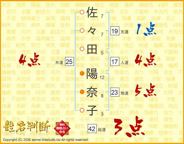 佐(7画)々(7画)田(5画) 陽(12画)奈(8画)子(3画)