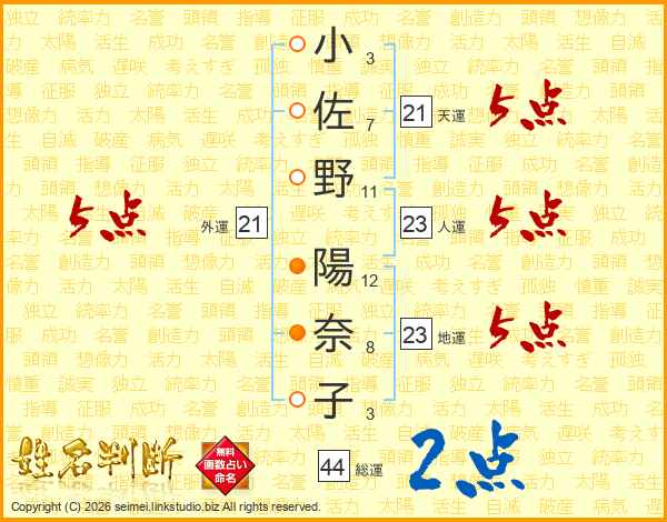 小(3画)佐(7画)野(11画) 陽(12画)奈(8画)子(3画)