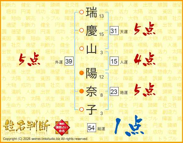 瑞(13画)慶(15画)山(3画) 陽(12画)奈(8画)子(3画)