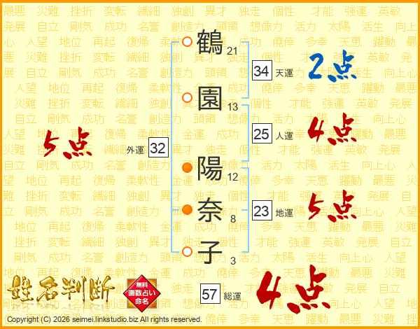 鶴(21画)園(13画) 陽(12画)奈(8画)子(3画)