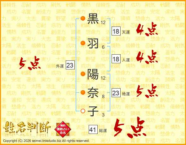 黒(12画)羽(6画) 陽(12画)奈(8画)子(3画)