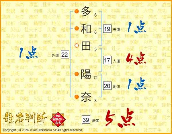 多(6画)和(8画)田(5画) 陽(12画)奈(8画)