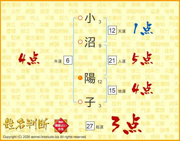 小(3画)沼(9画) 陽(12画)子(3画)