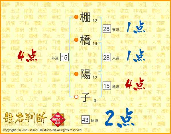 棚(12画)橋(16画) 陽(12画)子(3画)