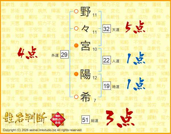 野(11画)々(11画)宮(10画) 陽(12画)希(7画)