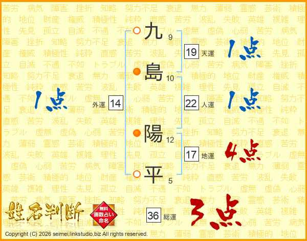 画数の奇数(○陽)と偶数(●陰)の配列で吉凶を占います。どちらかにかたよる名前は大凶名で避ける必要があります。画数の奇数偶数。