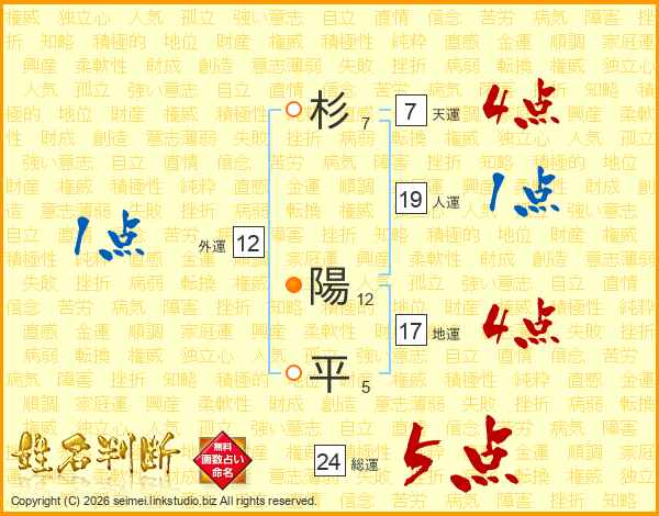 生活面を象徴する運勢です。外部から受ける影響力を表し、結婚運、家庭運や職場、環境への順応性を表します。総運から人運を引いた画数。姓や名が1文字の場合を除く。