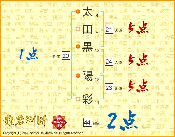 太(4画)田(5画)黒(12画) 陽(12画)彩(11画)