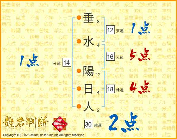 垂(8画)水(4画) 陽(12画)日(4画)人(2画)
