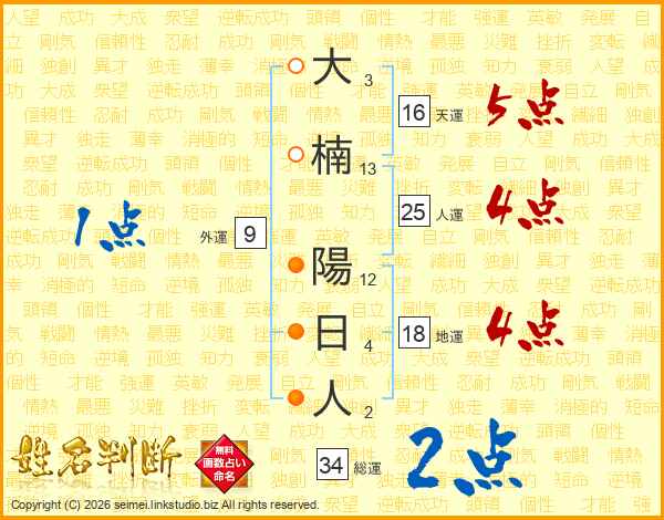 大(3画)楠(13画) 陽(12画)日(4画)人(2画)