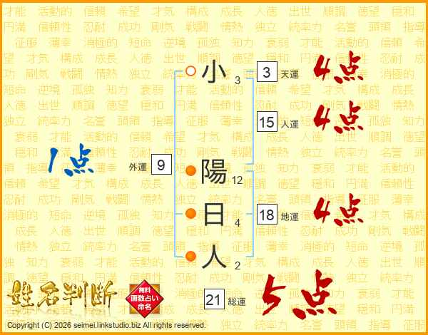 生活面を象徴する運勢です。外部から受ける影響力を表し、結婚運、家庭運や職場、環境への順応性を表します。総運から人運を引いた画数。姓や名が1文字の場合を除く。