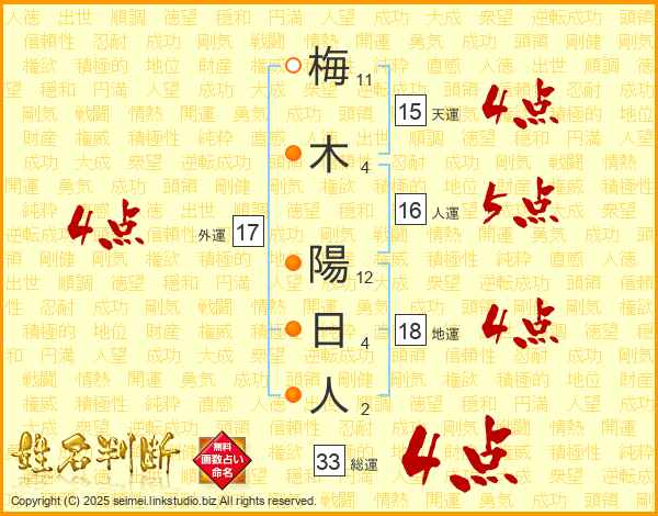 梅(11画)木(4画) 陽(12画)日(4画)人(2画)