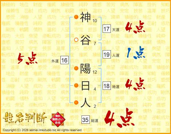 神(10画)谷(7画) 陽(12画)日(4画)人(2画)