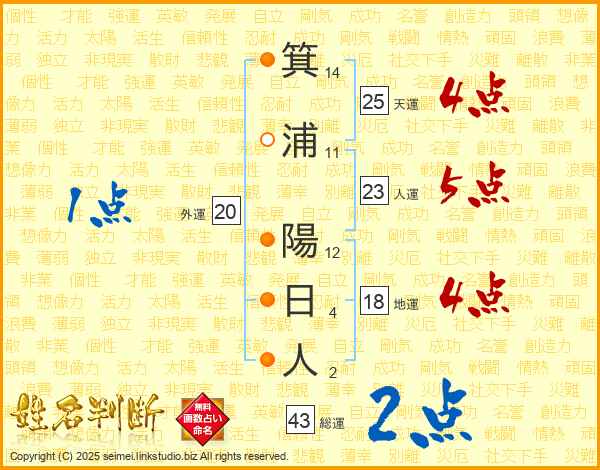 生活面を象徴する運勢です。外部から受ける影響力を表し、結婚運、家庭運や職場、環境への順応性を表します。総運から人運を引いた画数。姓や名が1文字の場合を除く。