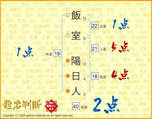 飯(13画)室(9画) 陽(12画)日(4画)人(2画)