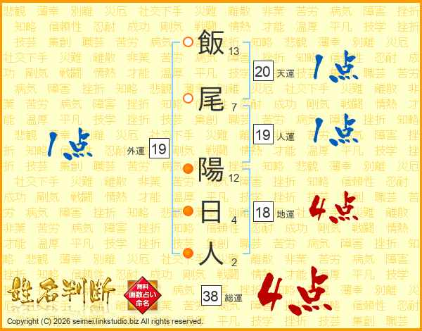 飯(13画)尾(7画) 陽(12画)日(4画)人(2画)