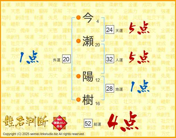 今(4画)瀬(20画) 陽(12画)樹(16画)