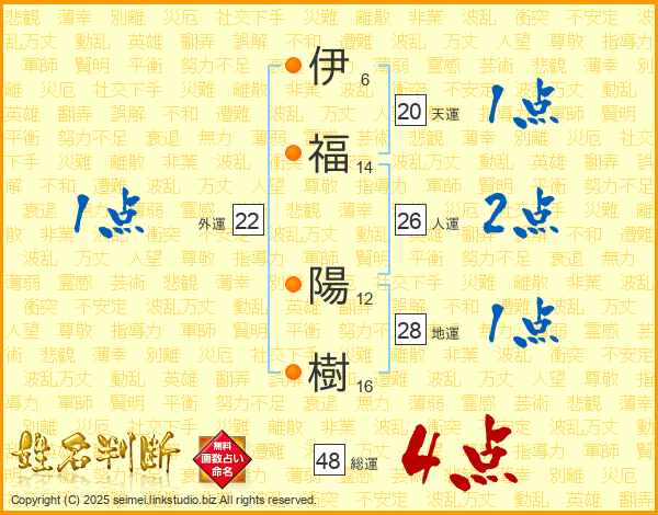 伊(6画)福(14画) 陽(12画)樹(16画)