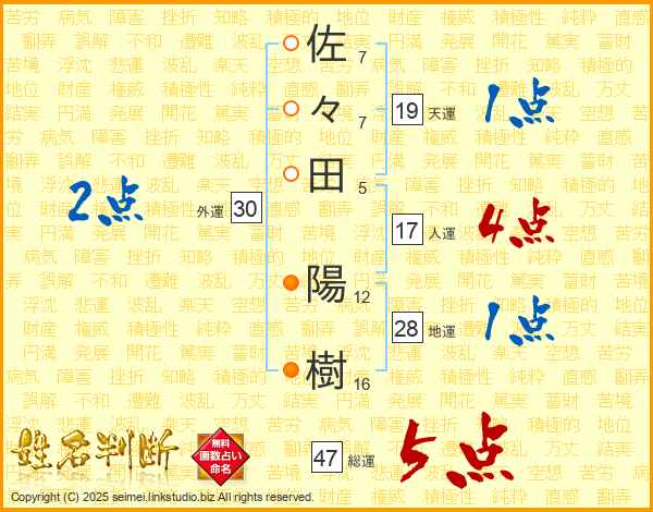 佐(7画)々(7画)田(5画) 陽(12画)樹(16画)