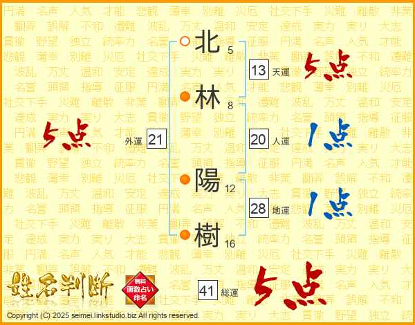 生活面を象徴する運勢です。外部から受ける影響力を表し、結婚運、家庭運や職場、環境への順応性を表します。総運から人運を引いた画数。姓や名が1文字の場合を除く。