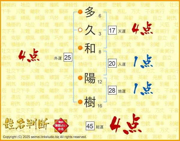 多(6画)久(3画)和(8画) 陽(12画)樹(16画)