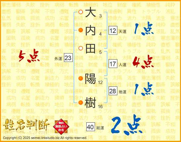 大(3画)内(4画)田(5画) 陽(12画)樹(16画)