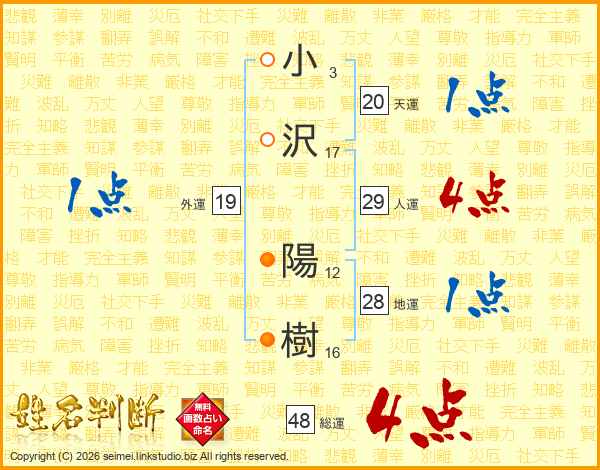 小(3画)沢(17画) 陽(12画)樹(16画)
