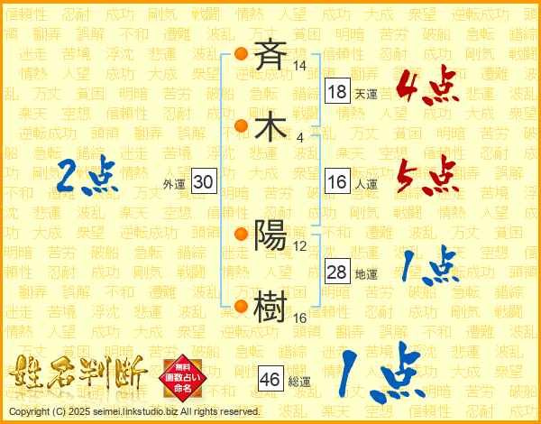 斉(14画)木(4画) 陽(12画)樹(16画)