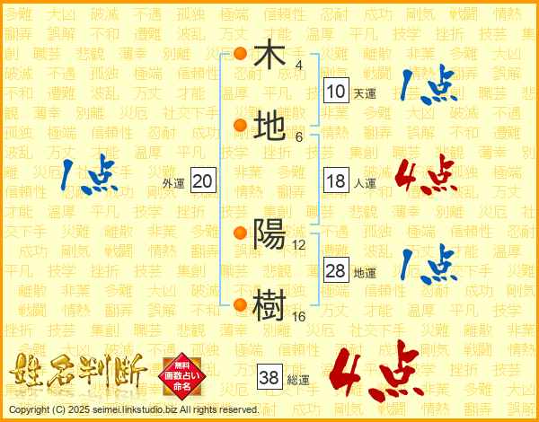 生活面を象徴する運勢です。外部から受ける影響力を表し、結婚運、家庭運や職場、環境への順応性を表します。総運から人運を引いた画数。姓や名が1文字の場合を除く。
