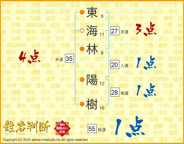 東(8画)海(11画)林(8画) 陽(12画)樹(16画)