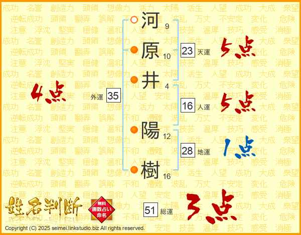 河(9画)原(10画)井(4画) 陽(12画)樹(16画)