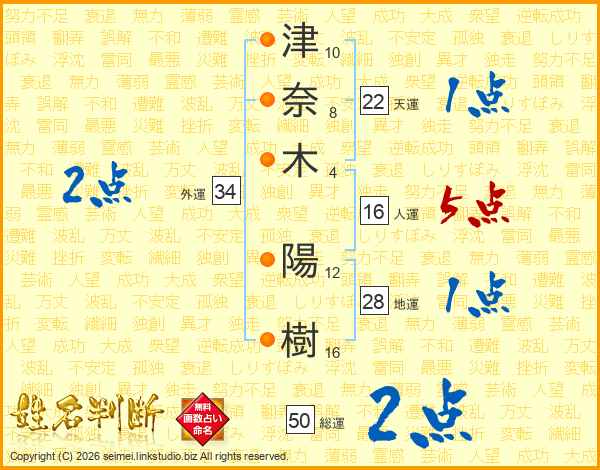 津(10画)奈(8画)木(4画) 陽(12画)樹(16画)