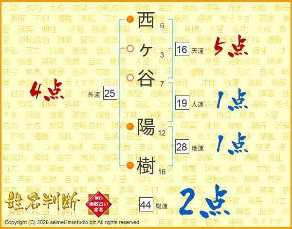 西(6画)ヶ(3画)谷(7画) 陽(12画)樹(16画)